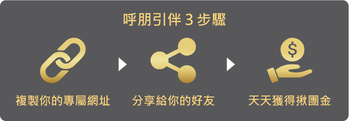 於活動期間內,您可獲得透過您專屬連結完成註冊的好友所產生【有效投注量*0.2%】的揪團金。